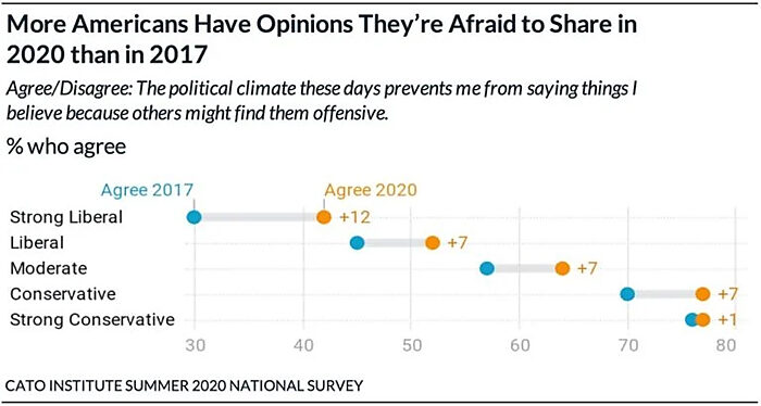 Also, centrist liberals flipped from feeling free to express themselves (54 percent) in 2017 to now feeling they no longer can (52 percent) in 2020. These data align with the largely liberal signatories of the Harper’s open letter defending political expression and criticizing cancel culture. These writers and scholars were not decrying being polite, but the spread of an illiberal zeitgeist that restricts free thought and discourse.