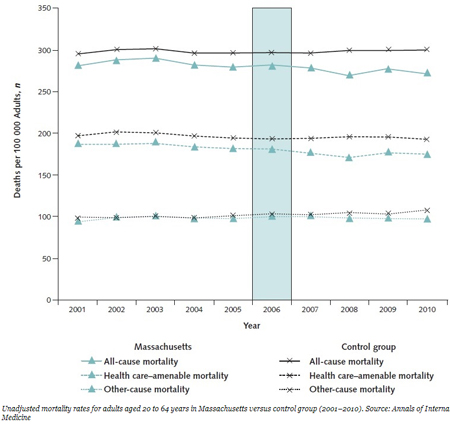 This Annals of Internal Medicine study is more like the latter Medicaid study. While its sample size is large, the authors caution, “we do not have individual-level insurance information and thus cannot directly link mortality changes to persons gaining insurance coverage” and “our quasi-experimental approach cannot definitively demonstrate a causal relationship underlying the association between the Massachusetts reform and the state’s declining mortality relative to other states. It is possible that the post-reform reduction in mortality in Massachusetts was due to other factors that differentially affected Massachusetts, such as the recession.”