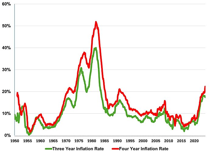 Consumer Price Inflation Over Three and Four Year Periods Has Been At Its Highest Rate Since The Early 1980s
