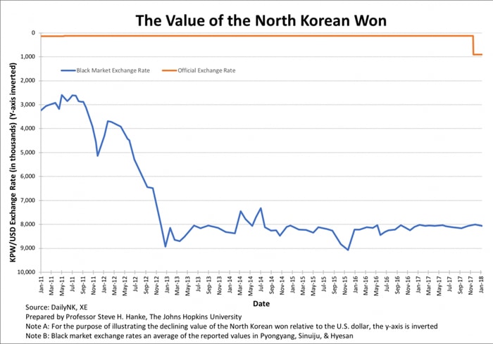 While it is difficult to obtain dependable economic data about the Hermit Kingdom, there are reliable data on key prices that, when properly interpreted, provide insights into the performance of the economy. The most important price in any economy is the free-market exchange rate between its domestic currency and the U.S. dollar—the world’s reserve currency. But, is there a free market for currency in North Korea? Well, yes, there is. North Korea has an active currency black-market where reliable North Korean won-U.S. dollar (KPW/USD) rates are regularly reported. And that’s not all. There is also a black market for rice—the most important staple in North Korea. Black-market rice prices are regularly reported, too. Armed with these two prices, we can lift the shroud of secrecy that covers the North Korean economy.