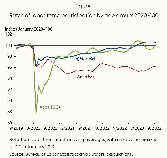 The pandemic accelerated the labor market effects of an aging U.S. population in two ways. First, many older American workers got really sick or even died, with sad and obvious implications for the economy. Second, many older workers retired early and, as shown in a March 2024 report from the San Francisco Fed, have never come back (red line below):