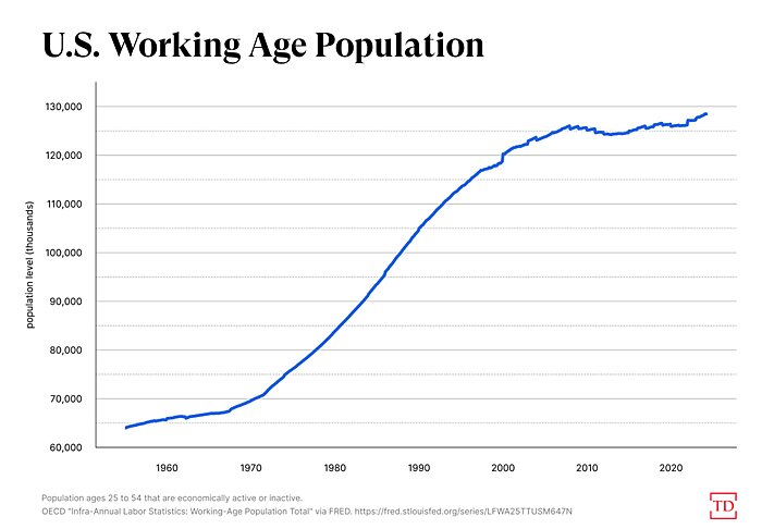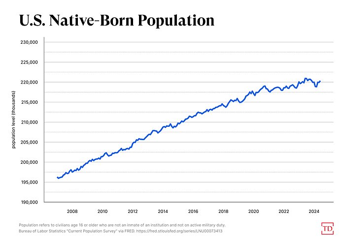 Matters are even worse when looking at just working-age Americans. The “prime age” (25–54) native-born population has been basically flat since 2013: