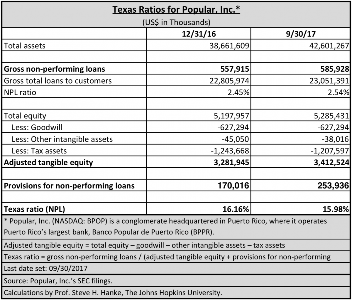 To conduct my diagnosis of Popular, Inc., I used a little known, but very useful formula to determine the Bank's health. It is called the Texas Ratio. It was used during the U.S. Savings and Loan Crisis, which was centered in Texas. The Texas Ratio is the book value of all non-performing assets divided by equity capital plus loan-loss reserves. Only tangible equity capital is included in the denominator. Intangible capital—like goodwill—is excluded.