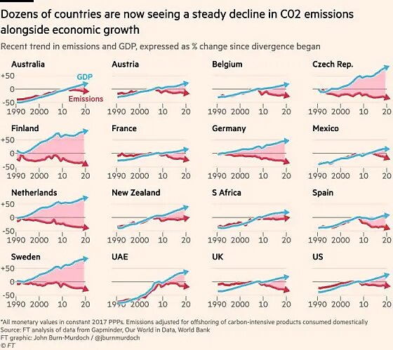 Starting in the 1980s with the advent of nuclear power, it became increasingly common to see countries cutting emissions while growing GDP. The pace of this decoupling has now accelerated as the shift from carbon-intensive manufacturing to services and from dirtier to relatively cleaner fossil fuels has been supercharged by proliferating cheap renewables. In 2016, 70 countries — more than one in three worldwide — had a run of at least five years in which carbon emissions declined while GDP grew. Green growth is already here.