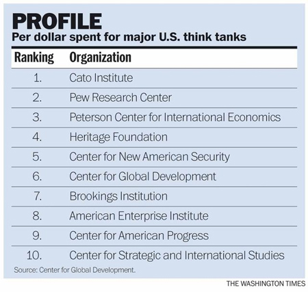 On Jan. 13, the Center for Global Development released its index of U.S. think tanks (note the accompanying chart), which was based on measurable criteria, such as media mentions, Web traffic, social media fans, and scholarly citations per dollar spent. By this measure, the Cato Institute was No. 1.