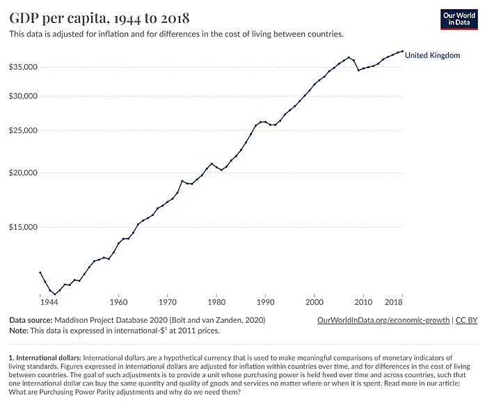 The greatest historian of economic facts was the late Angus Maddison of the Organisation for Economic Co-operation and Development (OECD), whose legacy has been maintained by the Maddison Project Database at the University of Groningen in the Netherlands. Below, courtesy of Our World in Data, are its figures for British economic growth since 1944.