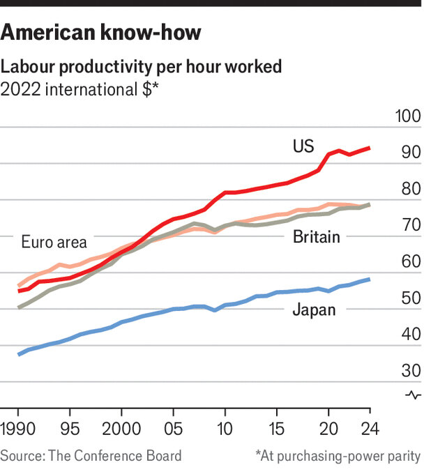 This year the average American worker will generate about $171,000 in economic output, compared with (on purchasing-parity terms) $120,000 in the euro area, $118,000 in Britain and $96,000 in Japan. That represents a 70% increase in labour productivity in America since 1990, well ahead of the increases elsewhere: 29% in Europe, 46% in Britain and 25% in Japan. … When assessed on a per-hour basis the gap remains sizeable: 73% productivity growth for American workers since 1990 versus 39% in the euro area, 55% in Britain and 55% in Japan.