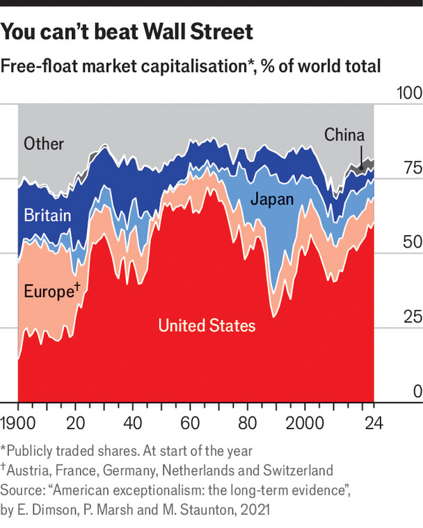 In part it continues a long-running phenomenon. In the 20th century American equities produced a real dollar return of 7% per year, versus 4.9% in the rest of the world…. What makes America’s stockmarket unique is its combination of enormous size and high returns. Still more striking, its return advantage over the rest of the world has grown over time.