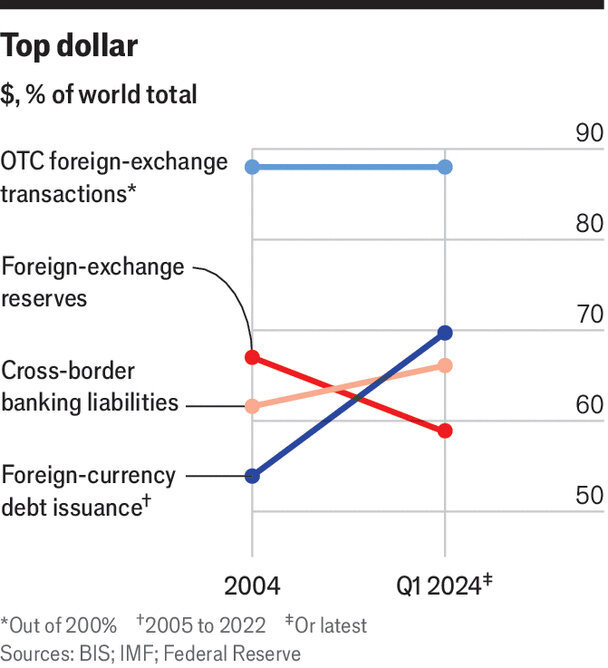 For trade, cross-border investment and foreign-exchange transactions, the dollar remains by far the currency of choice. Its appeal gives America a seemingly endless supply of credit and the power to cripple foreign financial entities with sanctions. Its strength means that at market exchange-rates America counts for over a quarter of the world economy, the same as in 1990.