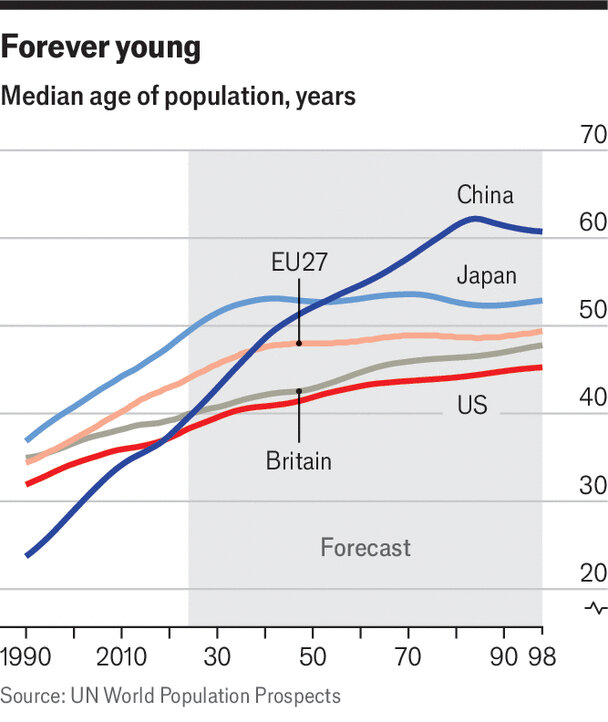 Even Mr Trump, when not promising expulsions, says the country needs to bring in more skilled workers; he has mused about giving green cards to foreign-born graduates of American universities. Today, America accounts for 4% of the world’s population, and by 2100 it will still be about the same, according to projections by the UN. During that same time, China’s share is expected to fall from 18% to 6%, while the European Union will go from 6% to 3.5%. And America will, in relative terms, be a younger country.