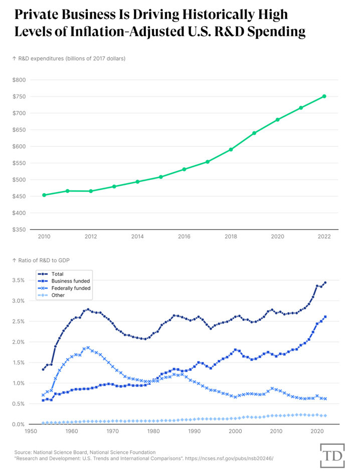 Beyond The Economist’s report, there’s other good news. For example, the latest report from the National Science Foundation shows that U.S. R&D spending in 2022 (the last year available and notably before the new U.S. industrial policy push really got going) climbed to a record high a few years ago and then just kept on climbing, driven almost entirely by private business: