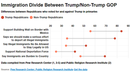 This is a total gamble. Why? Because statistical models based on public opinion polling data shows that immigration attitudes are by far the strongest driver of Trump's core support. Indeed, Trump supporters' immigration attitudes are far different from even fellow Republicans who did not vote for Trump in the primaries. Take for instance that a majority (52%) of Trump's supporters say illegal immigrants should not be allowed to stay in the country, while in sharp contrast 64% of non-Trump Republicans favor giving legal status.