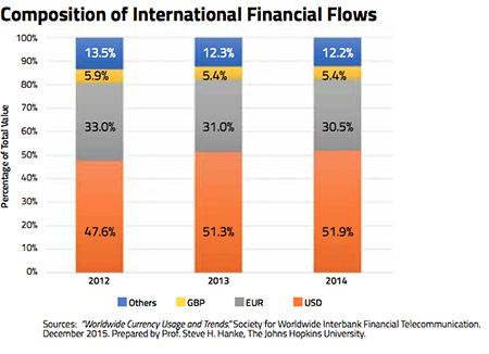 The dollar is King, and when it comes to currencies, Kings are difficult to dethrone. Even after the introduction of the euro in 1999, the USD has maintained its top spot as the currency held as official reserves, accounting for 63 percent of the total. When it comes to foreign exchange trading, the dollar is even more dominant, accounting for almost 88 percent of the turnover. Dollar notes are widely used internationally, too, with as much as two-thirds of all the greenbacks in circulation circulating overseas. In terms of the transactions handled by the Society for Worldwide Interbank Financial Telecommunication (SWIFT), the outfit that moves “money” among banks, the U.S. dollar has increased its dominance over the past few years, accounting for almost 52 percent of the total transactions (see the accompanying chart).