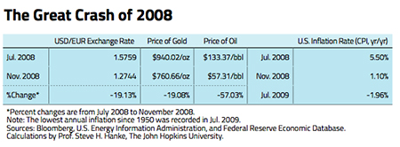 When viewing the twists and turns of the greenback in Jacque de Larosière’s anti-system, there is no better place to start than the Great Crash of 2008. The accompanying chart shows that the USD/€ exchange rate — the world’s most important price — fell a stunning 19.13 percent over a brief four month period. Linked to the soaring dollar, two other important prices, gold and oil, collapsed by 19.08 and 57.03 percent, respectively. Not surprisingly, the annual inflation rate in the U.S. moved from an alarming rate of 5.5 percent in July to an outright deflation of -1.96 percent a year later. Contrary to the Federal Reserve’s claims, the dance of the dollar and related changes in commodity prices and the level of inflation indicated that monetary policy was way too tight in late 2008. This caused massive instability that we still haven’t fully recovered from.