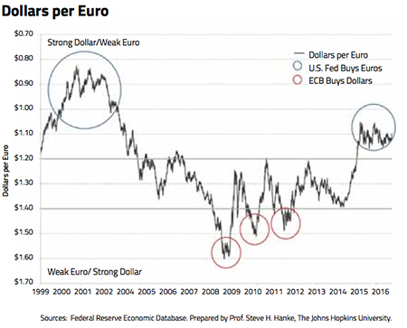 What can be done to reduce the instability in the current anti-system and mitigate the damage caused by the twists and turns of King dollar? The world’s two most important currencies — the dollar and the euro — should, via formal agreement, trade in a zone ($1.20 – $1.40 to the euro, for example). The European Central Bank would be obliged to maintain this zone of stability by defending a weak dollar via dollar purchases. Likewise, the Fed would be obliged to defend a weak euro by purchasing euros. Just what would have happened under such a system (counterfactually) since the introduction of the euro in 1999 is depicted in the accompanying chart.