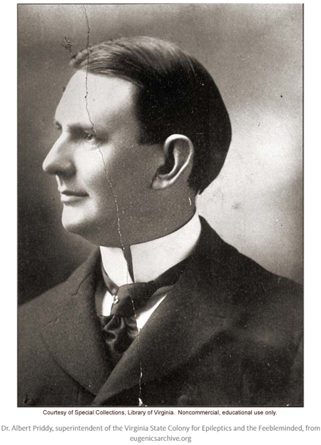 Dr. Albert Priddy of the Virginia State Colony for Epileptics and Feeble-minded could fairly be described as a zealot of eugenics. Prior to 1924, Priddy had performed hundreds of forced sterilizations by creatively interpreting laws which allowed surgery to benefit the "physical, mental or moral" condition of the inmates at the Colony. He would operate to relieve "chronic pelvic disorder" and, in the process, sterilize the women. According to Priddy, the women he chose were "immoral" because of their "fondness for men," their reputations for "promiscuity," and their "over-sexed" and "man-crazy" tendencies. One sixteen-year-old girl was sterilized for her habit of "talking to the little boys."