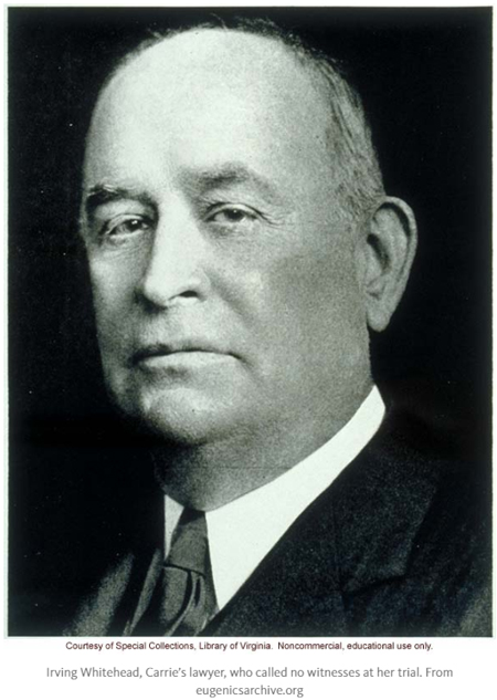 In order to fully validate the law to Priddy’s satisfaction, the Board’s determination had to be defended in court. Thus, Irving Whitehead was appointed to “defend” Carrie from the Board’s ruling. Whitehead was not only a close friend of Priddy, but he was a former member of the Colony Board and, unsurprisingly, a staunch believer in forced sterilization.