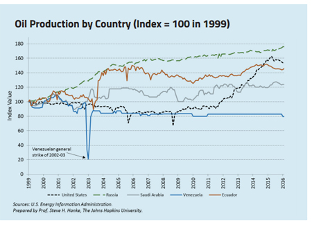 Let's look at oil production. Venezuela has the largest proven oil reserves in the world — even greater than Saudi Arabia. But, the oil output of Venezuela's state-owned oil company, PDVSA, is only 80 percent of what it was in 1999 (see the accompanying chart). In contrast, Ecuador's oil output has jumped in the post-dollarization period and is now over 40 percent higher than in 1999.