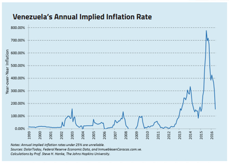 Venezuela's inflation record under Chávez was dismal, and under Maduro it has been catastrophic. For the past three years, Venezuela's inflation rate has held the world's top spot. It reached an annual rate (year-over-year) of almost 800 percent in the summer of 2015 and is 145 percent at present, still the world's highest rate (see the chart below). In contrast, Ecuador's annual inflation during the last ten years — dollarized years — has averaged 5.2 percent.