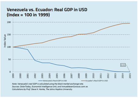 The comparative exercise requires us to calculate the real GDP (absent inflation) and do so in U.S. dollar terms for both Venezuela and Ecuador. Since Ecuador is dollarized, there is no exchange-rate conversion to worry about. GDP is measured in terms of dollars. Ecuadorians are paid in dollars. Since 1999, Ecuador's real GDP in dollar terms has almost doubled.