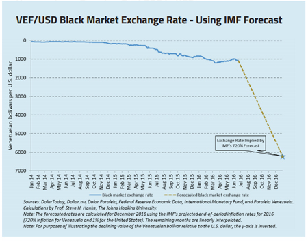 So, where is Venezuela going? According to the International Monetary Fund's (IMF) forecast, inflation will be 720 percent by the end of the year. We can reverse engineer the IMF's inflation forecast to determine the bolívar-greenback exchange rate implied by the inflation forecast. When we conduct that exercise, we calculate that the VEF/USD rate moves from today's black market (read: free market) rate of 1079 to 6,218 by year's end. So, the IMF is forecasting that the bolívar will shed 83 percent of its current value against the greenback by New Year's Day, 2017. The following chart shows the dramatic plunge anticipated by the IMF.