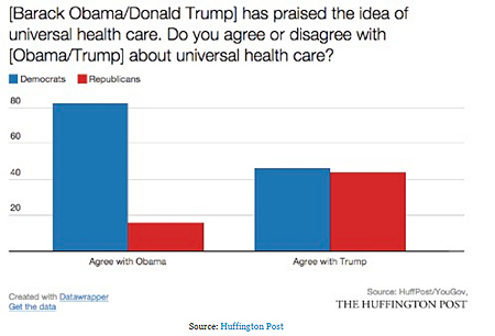 In the last seven years, no issue has so unified the GOP base as opposition to Obamacare, yet when told that Trump supported universal health care, Republican respondents' support rose 28 points compared to those who were told that Obama supported it. Now, in fairness, Democratic support for universal health care dropped 36 points when told that Trump favored it, so this problem is not exclusive to the GOP. Nevertheless, the apparent willingness of supposedly conservative voters to discard their principles so cheaply should be no less disconcerting.