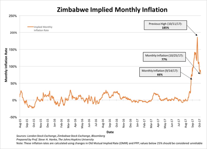 After doing so, we find that Zimbabwe is experiencing hyperinflation for the second time in less than ten years. Hyperinflation occurs when the monthly inflation rate reaches 50% per month and remains above that rate for at least 30 consecutive days. This initial threshold was breached on September 14, 2017, and has remained above this rate since then. Thus, Zimbabwe is in the throes of an ignominious hyperinflation, in which the monthly rate of inflation is 77% and the annual rate is 348%, as of October 25, 2017.