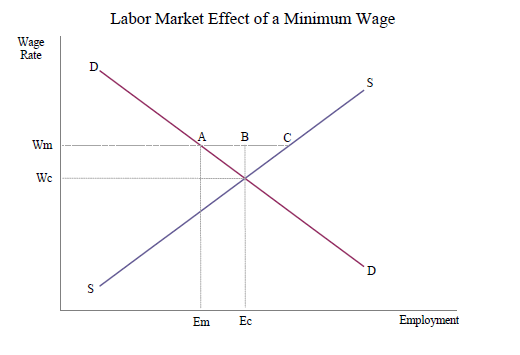 The figure shows a hypothetical competitive local labor market. The market demand curve for labor is DD, and the market supply curve is SS. Their intersection determines the competitive wage, Wc, with employment Ec. If the minimum wage is set at Wm, employment is reduced to Em. The reduction in employment is smaller than the excess supply of labor (the distance AC). The excess supply of labor includes both a reduction in employment (fewer hours and job opportunities, or AB) along with a second component consisting of workers who are drawn into the labor market by the prospect of earning the higher minimum wage (BC). Although some of the workers who are drawn into the labor market (typically those with higher skills) may succeed in finding one of the minimum wage jobs, it comes at the expense of lower skilled workers who are shut out of the labor market.