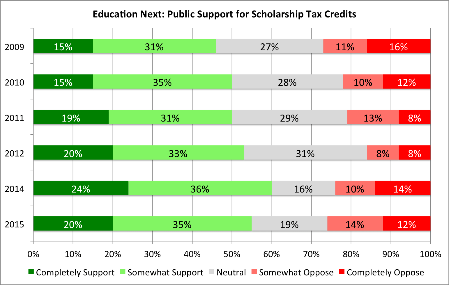 Support for STCs in the Education Next surveys has grown over time, reaching a high of 60 percent in 2014, though it dipped slightly in 2015. Since 2012, STCs have garnered support from a majority of respondents each year. (Education Next did not ask about STCs in 2013.)