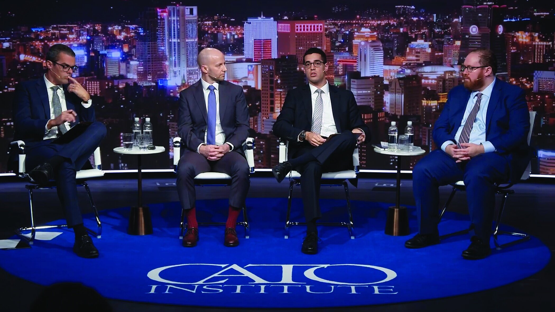 Justin Logan (far left), Cato’s director of defense and foreign policy studies, invited Chris Miller (far right), former acting US secretary of defense, to join him in conversation with Politico reporter Alex Ward (middle left) about Ward’s new book, The Internationalists: The Fight to Restore American Foreign Policy after Trump. Emma Ashford (middle right), senior fellow at the Stimson Center, also commented on how history may view the Biden administration’s foreign policy.