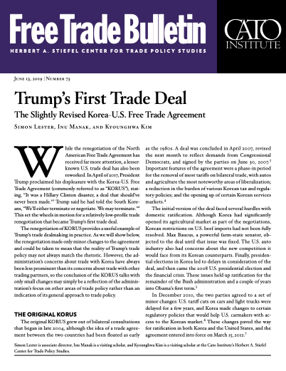 While the renegotiation of the North American Free Trade Agreement has received far more attention, a lesser-known U.S. trade deal has also been reworked. In April of 2017, President Trump proclaimed his displeasure with the Korea‑U.S. Free Trade Agreement (commonly referred to as “KORUS”), stating, “It was a Hillary Clinton disaster, a deal that should’ve never been made.”1 Trump said he had told the South Koreans, “We’ll either terminate or negotiate. We may terminate.”2 This set the wheels in motion for a relatively low-profile trade renegotiation that became Trump’s first trade deal.