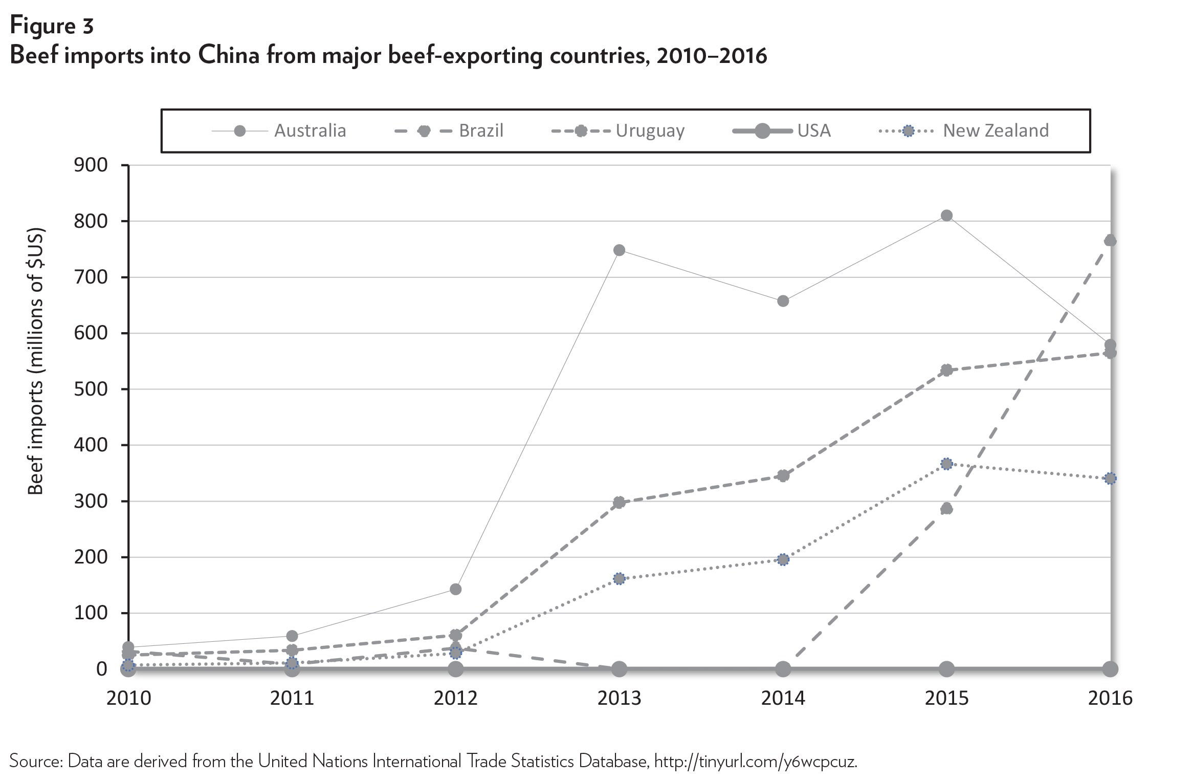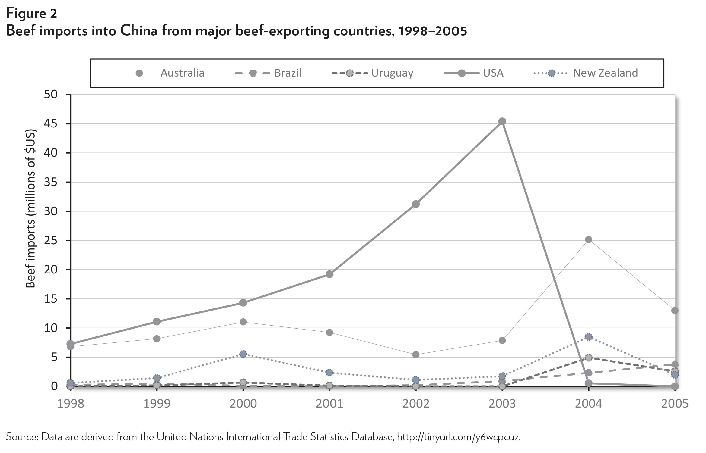 Figure 1 shows the share of imports into the Chinese market held by the major beef-exporting countries since 1998. U.S. exports dominated the market at the beginning of the period but almost completely disappeared after 2004 because of a Chinese ban on U.S. beef after the BSE outbreak. Since then, other countries have controlled the import market.