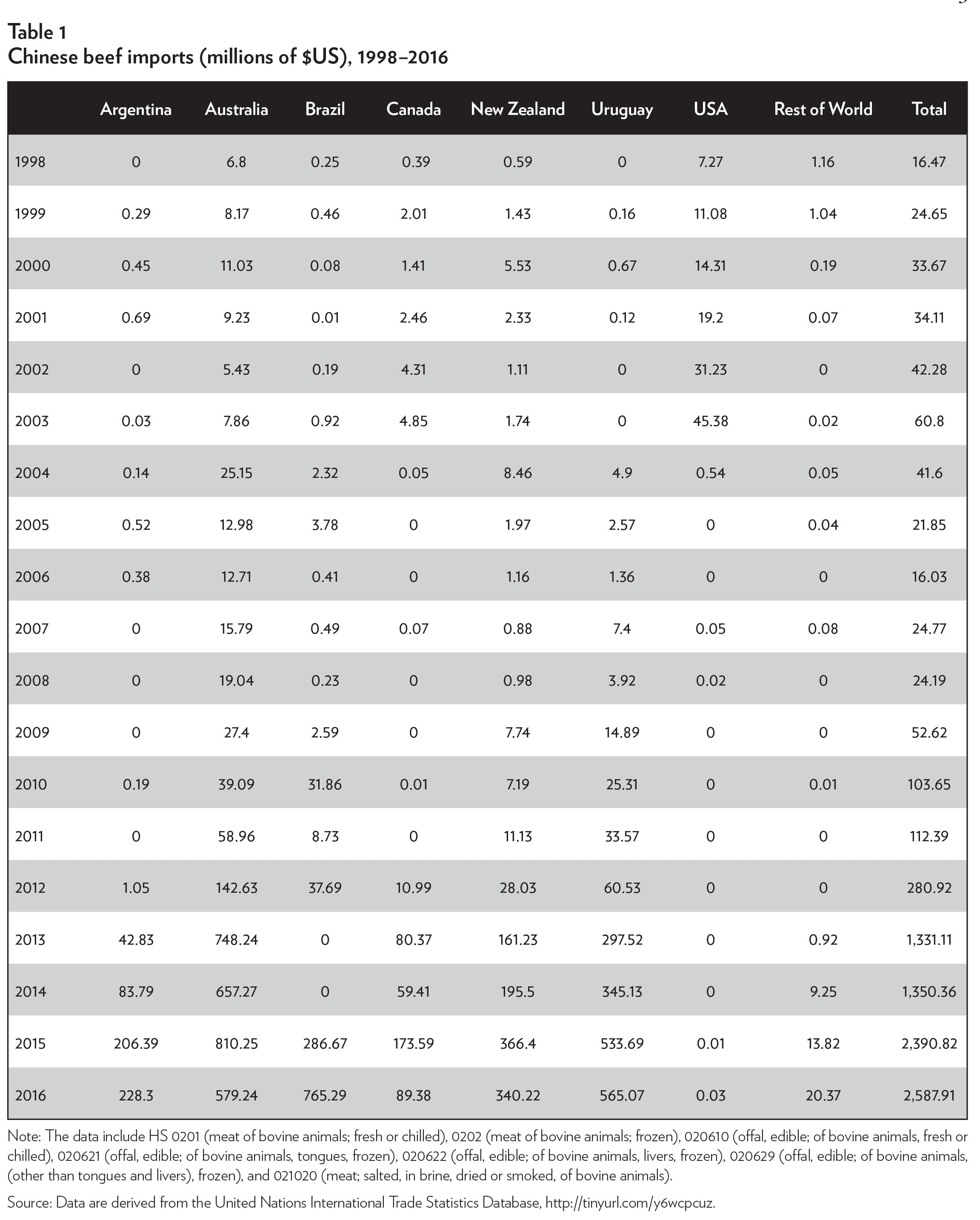 Over time, domestic production could no longer meet demand, and beef imports began to increase. Table 1 shows beef imports into China since 1998, by country. As shown in the table, China imported just $16 million worth of beef from all trading partners in 1998. That number jumped to $61 million in 2003, but imports declined in 2004 after an outbreak of bovine spongiform encephalopathy (BSE), also known as mad cow disease, in 2003. Imports increased again in 2009 and have continued to grow. In 2016, China's total beef imports exceeded $2.5 billion.