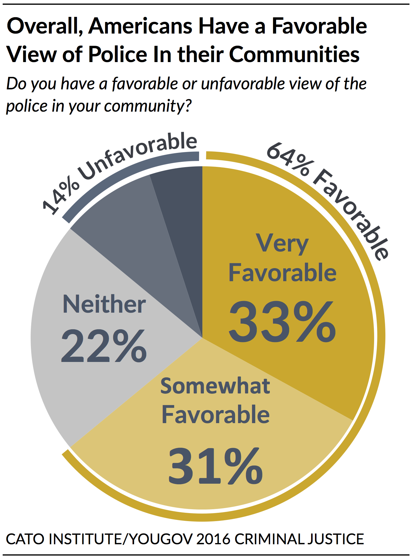 At first glance Americans seem generally satisfied with their local law enforcement. Nearly two-thirds (64%) of Americans have a favorable view of the police in their communities, including 33% who have a "very favorable" and 31% who have a "somewhat favorable" view. Only 14% say they have an unfavorable view of their local police, and another 22% say they have neither positive nor negative feelings. (See Appendix B for citizen evaluations of police.)