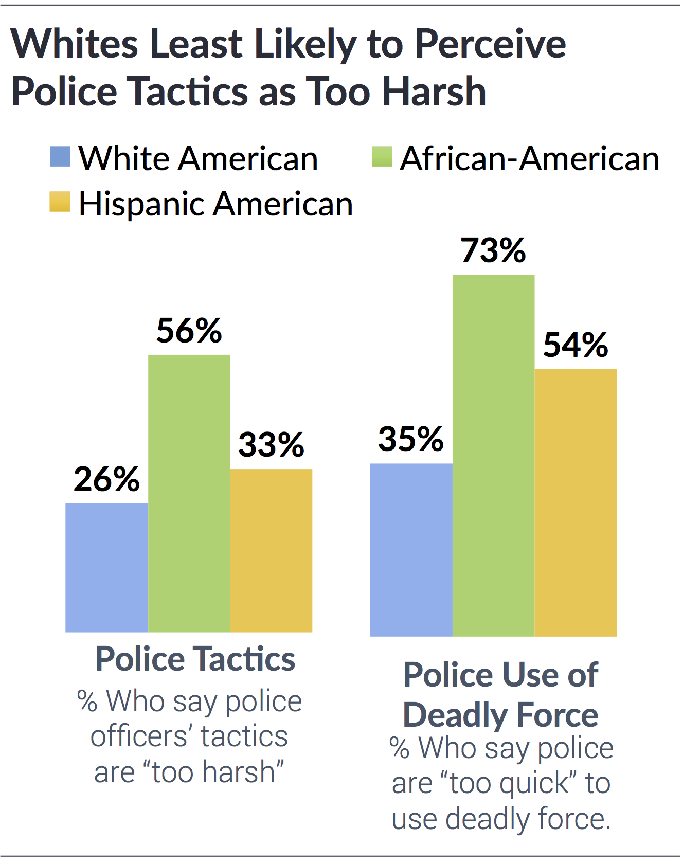 Six in 10 African Americans say police tactics are "too harsh" and 7 in 10 say police are too quick to resort to deadly force. In contrast, 7 in 10 whites think that police tactics are appropriate and that police only use necessary lethal force. Hispanics are in between: although a majority (54%) say police often unnecessarily resort to lethal force, a majority (58%) also say routine police tactics are reasonable.