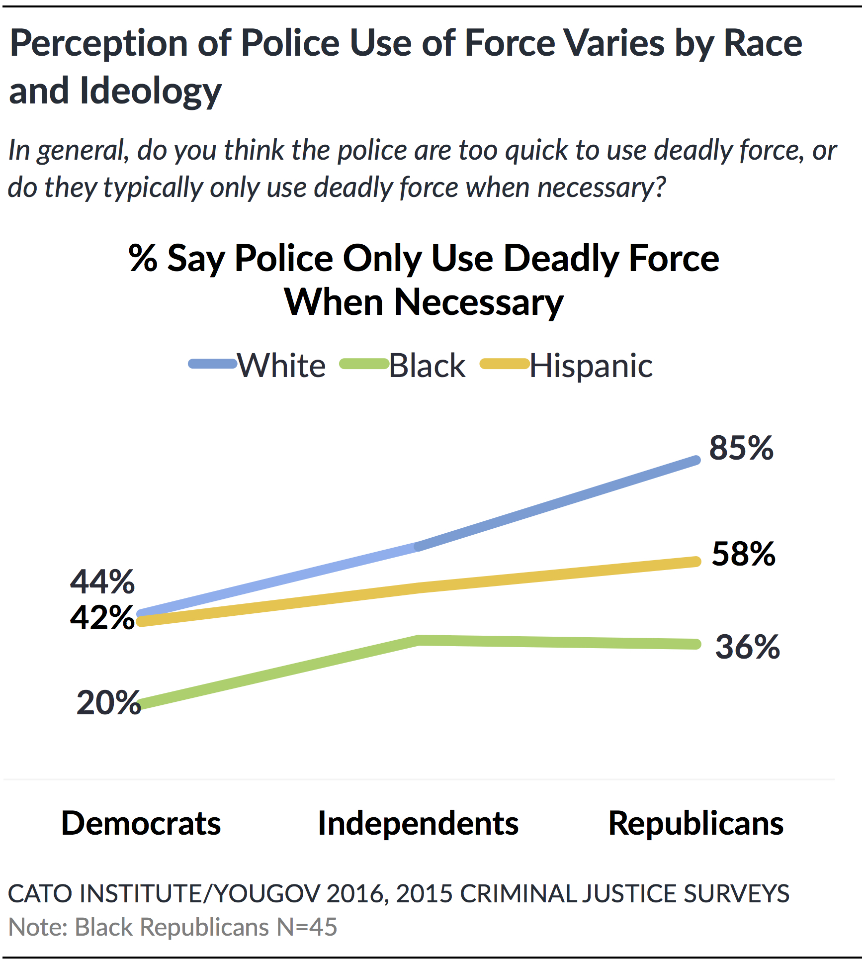 Again, race matters more than partisanship in perceptions of police use of force. White Republicans are 41 points more likely than white Democrats to say police only use necessary deadly force (85% vs. 44%).53 However, black Republicans (36%) are only 16 points more likely than black Democrats (20%) to agree. In a similar fashion, Hispanic Republicans are only 16 points more likely than Hispanic Democrats to believe police only use necessary force. (58% vs. 42%).