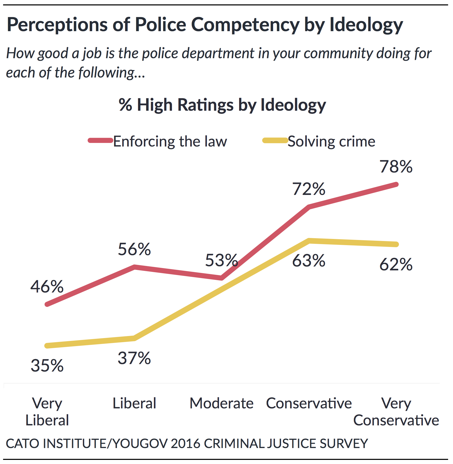 Perceptions of police competency strongly correlate with ideology. Seventy-eight percent (78%) of respondents who identify as "very conservative" gave their local police high ratings for enforcing the law, while only 46% of "very liberal" respondents agree. Similarly, while 62% of very conservative respondents have high confidence in their local police departments' ability to solve crime, only 35% of very liberal respondents agree.