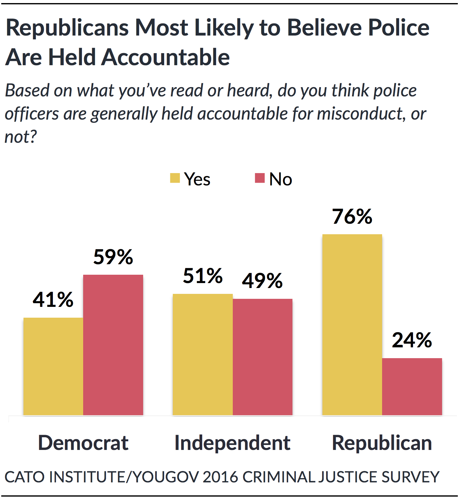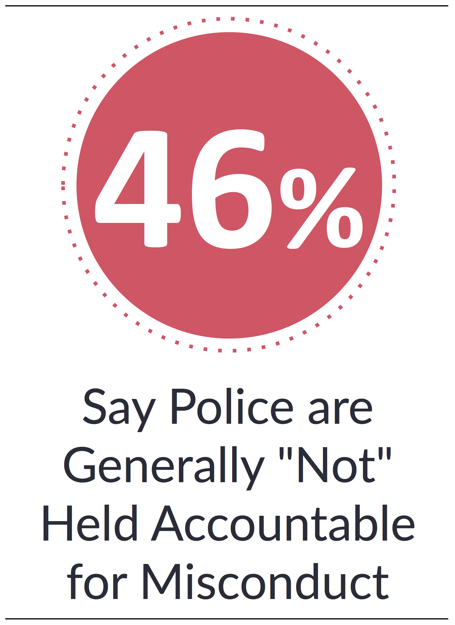 Nearly half of Americans (46%) believe police are not "generally held accountable for misconduct" when it occurs, while 54% believe they are. It is remarkable that nearly half believe misconduct "generally" is not brought to account. This view is held by larger shares of black and Hispanic Americans, younger people, lower income individuals, and Democrats.