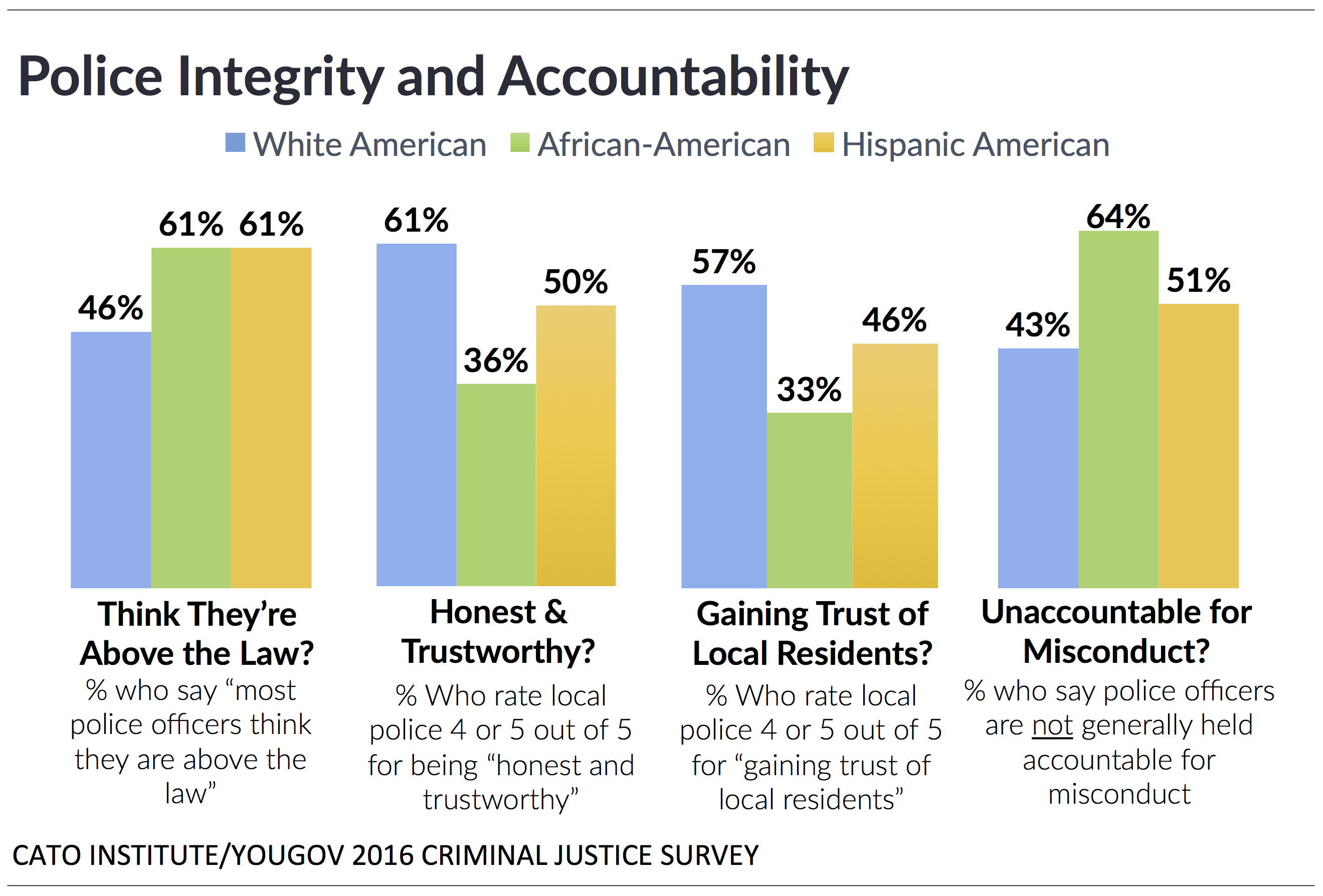 About two-thirds (64%) of African Americans and 52% of Hispanics believe police "generally" are not held accountable for misconduct. In contrast, 57% of white Americans think police are held accountable.