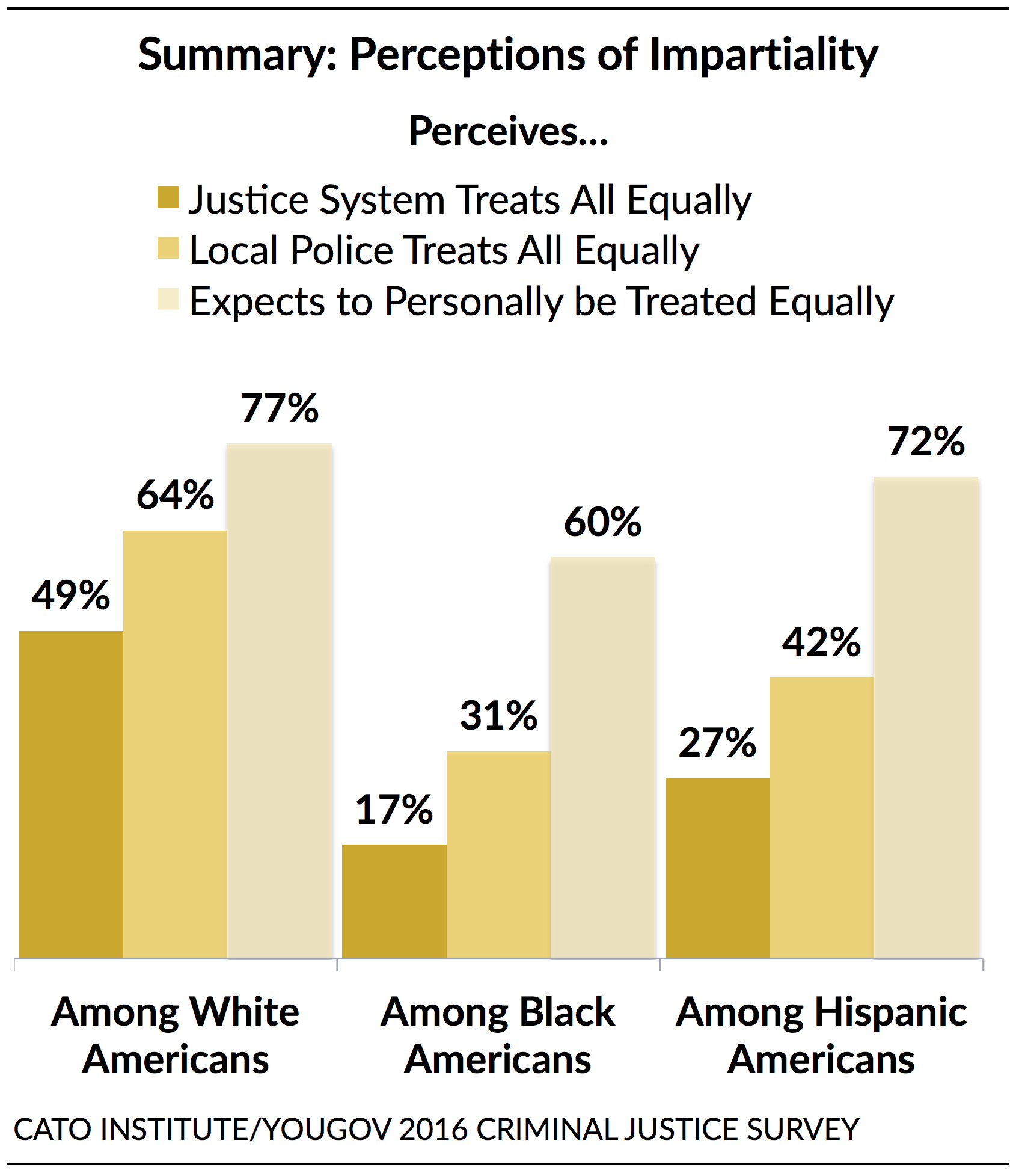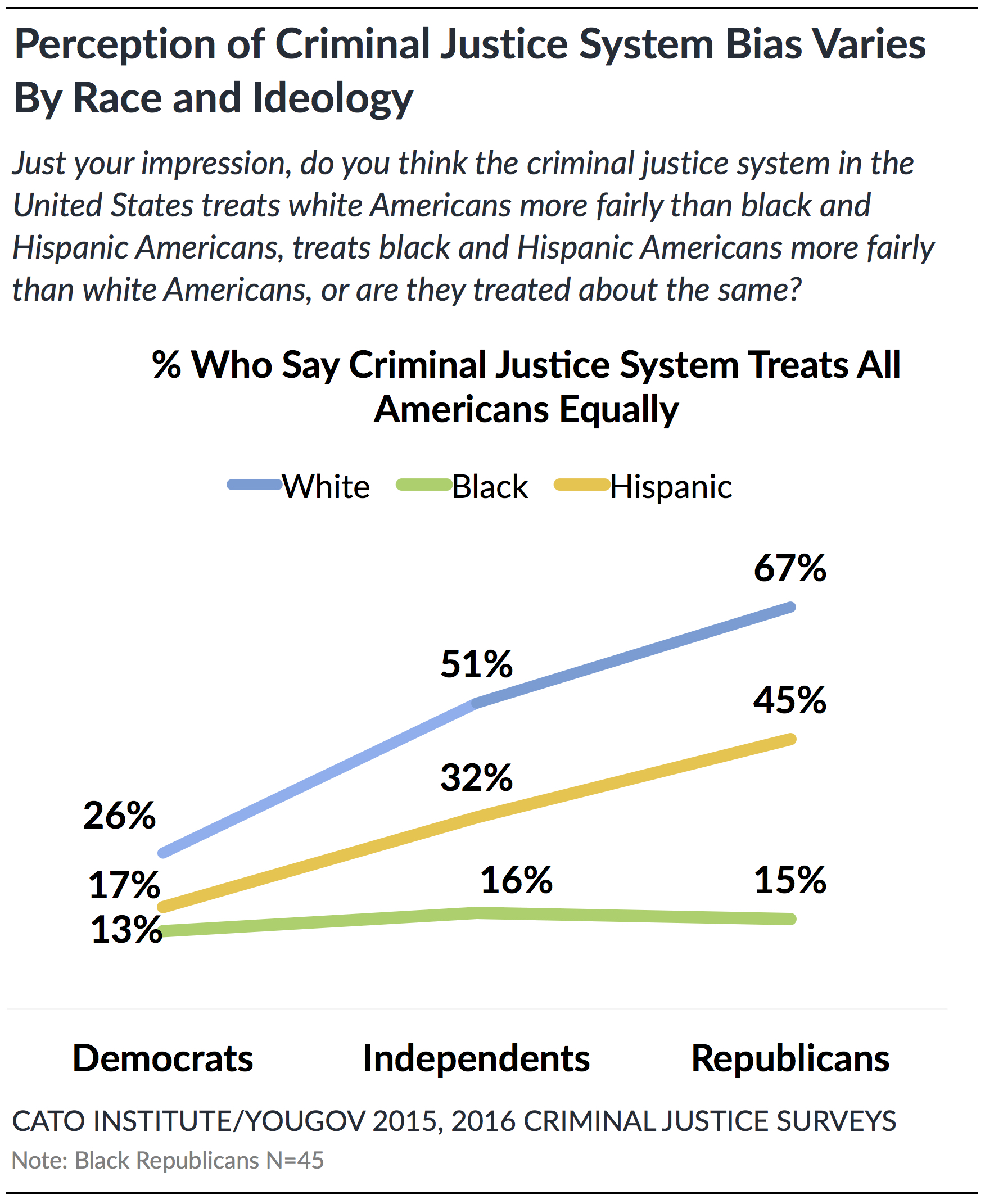 Perceptions of bias vary widely by race, ethnicity, and partisanship. About half (49%) of white Americans believe the criminal justice system treats everyone about the same. Only 17% of black Americans and 27% of Hispanic Americans agree. Instead, a strong majority (72%) of African Americans, a slim majority of Hispanics (51%), and 40% of Caucasians believe the justice system gives preferences to whites. About 1 in 10 black and white Americans and 2 in 10 Hispanic Americans think the justice system offers greater leniency to minorities.