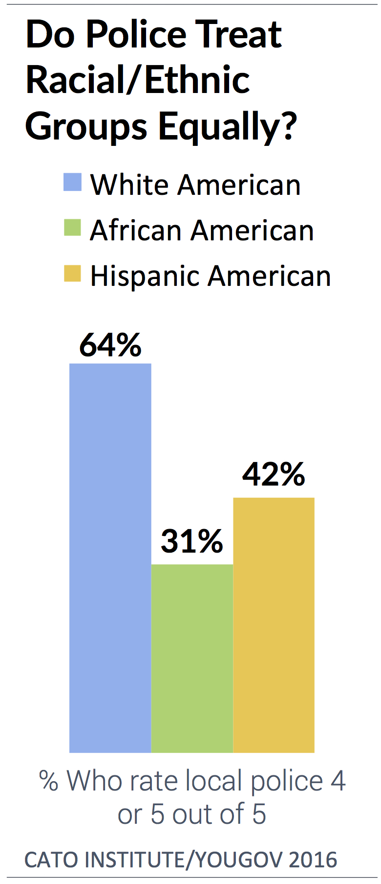 Local Police Departments These confidence gaps extend to evaluations of local police departments. While 64% of white Americans highly rate their local police for impartiality, only 31% of African Americans and 42% of Hispanics agree.44 Republicans (78%) are also considerably more likely than Democrats (40%) and independents (57%) to highly rate their local police for impartiality.