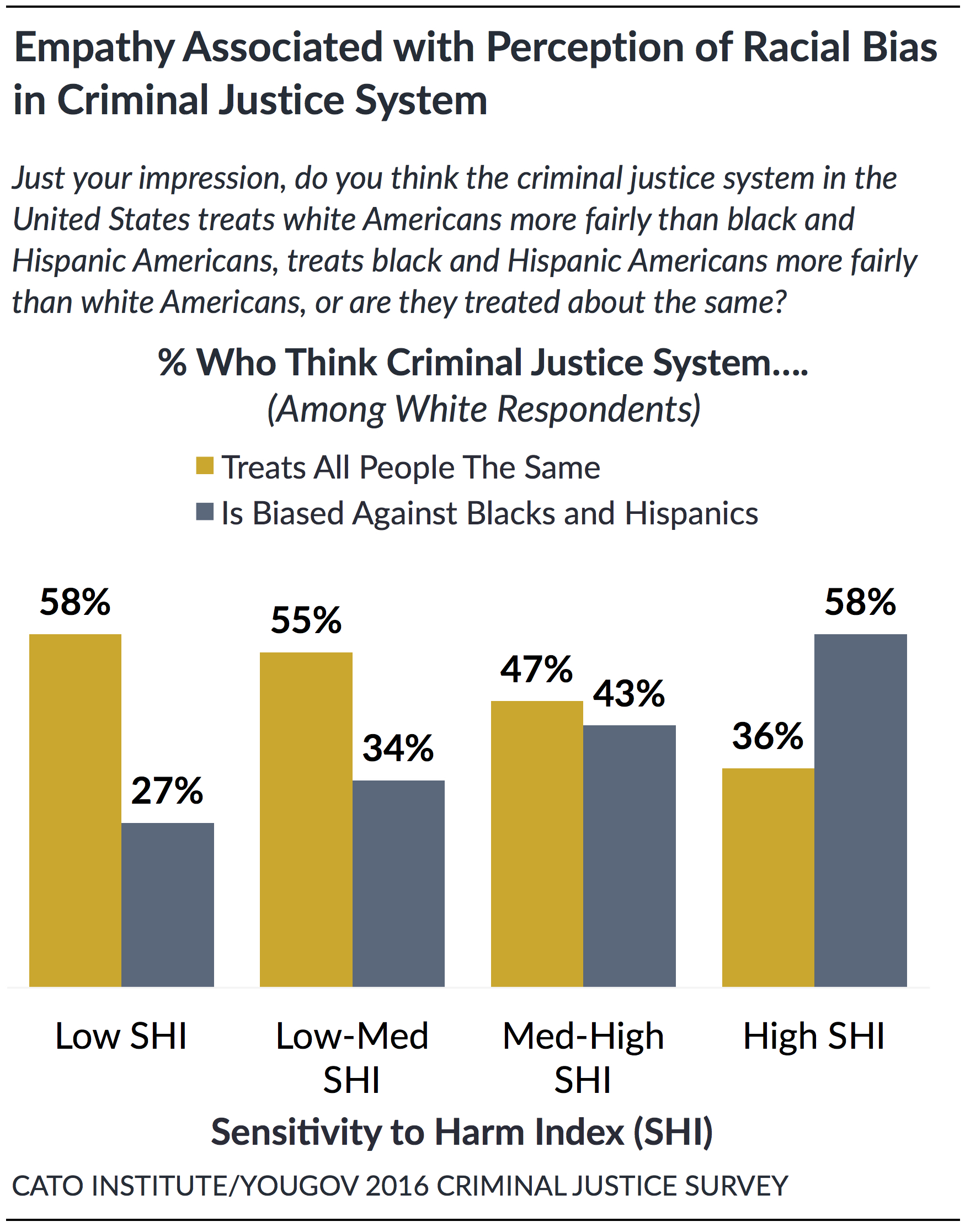 Individuals who score high on the Sensitivity to Harm Index (SHI) are far more likely to believe racial bias is a problem in the criminal justice system. For instance, 58% of whites with high SHI scores believe the justice system is biased against blacks and Hispanics compared to 27% among those with low scores.48 Whites who score low on SHI are far more likely to say the system treats everyone the same than those who score high (58% vs. 36%). These results suggest that people who tend to empathize may be more sensitive to charges of racial bias in police encounters.