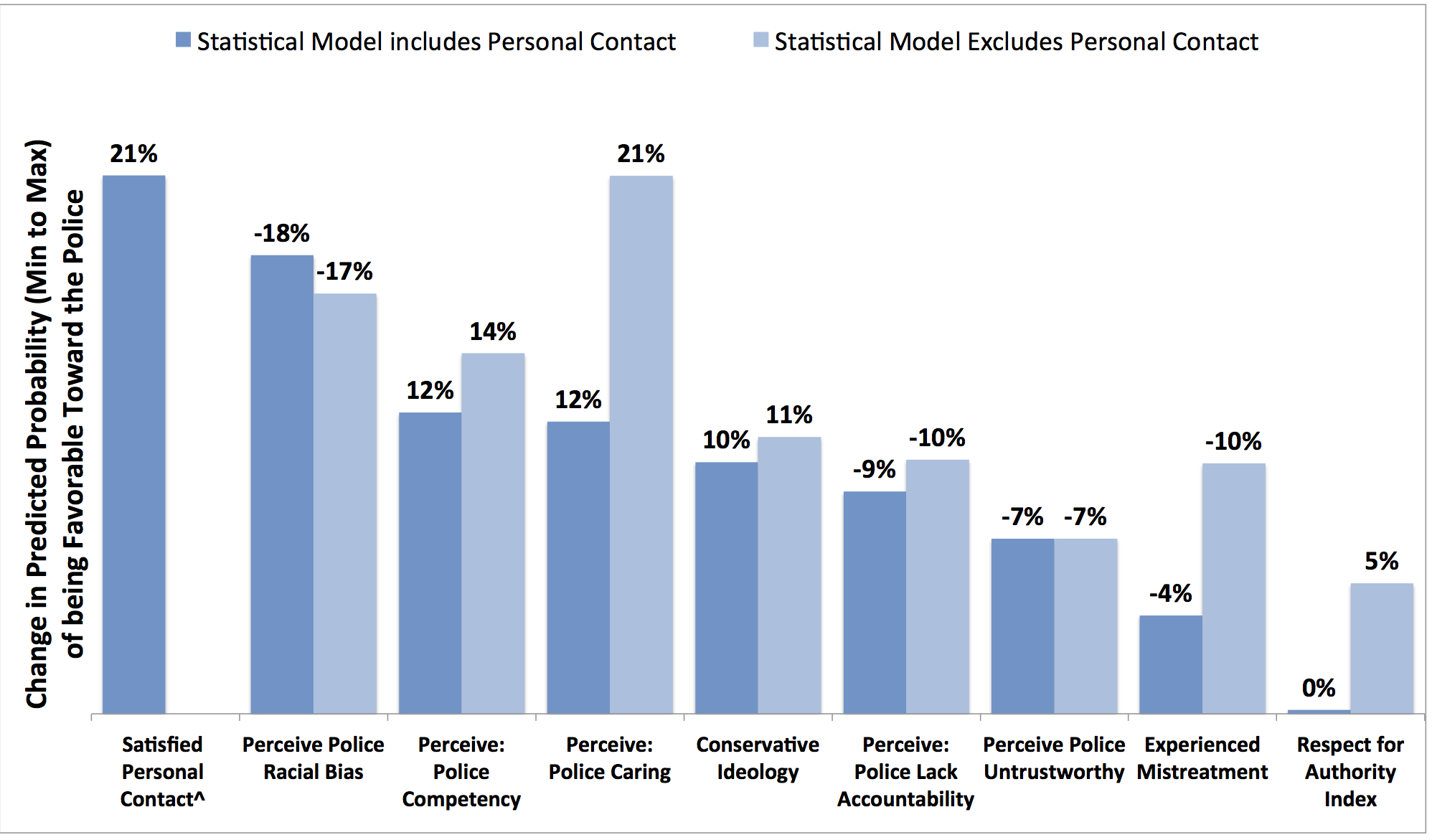 | As the previous data makes clear, on average, black Americans, younger people, lower income individuals, urban residents, and liberals tend to have a more negative view of police integrity, use of force, impartiality, competency, accountability, and tactics. Conversely white Americans, older people, middle and higher income individuals, suburbanites, and conservatives tend to have a more positive view of the police. Hispanics typically take a middle ground, but are concerned about current policing practices. If we are to improve public perceptions of the police and strengthen legitimacy of the law, ideally we’d like to know what’s really driving favorable and unfavorable attitudes toward the police. This is a difficult task because these attitudes are confounded. For instance, a person who thinks the police aren’t held accountable also likely thinks the police are racially biased. How might we unpack this puzzle? Statistical analyses can offer some clues. A statistical test (logit regression) can simultaneously take into account people’s backgrounds, experiences, and perceptions of police to determine which best predict favorable or unfavorable attitudes toward the local department. (Appendix I details which survey questions were used to measure each variable, and provides further methodological details). Demographics What demographic variables best predict attitudes toward the police? The previous survey results demonstrate that differences in favorability toward the police are most dramatic across racial groups. A statistical test (logit regression) confirms that both being African American and Hispanic strongly and significantly predict unfavorable attitudes toward the police; the prediction is especially stronger among African Americans.60 However, once age and education are accounted for in the model, being Hispanic no longer significantly predicts negative attitudes (see Appendix J.1).61 Perhaps with time, as Hispanics age and move up the educational and income ladders, the relationship between the police and the Hispanic community may improve. However, controlling for other standard demographic factors does not affect the relationship between being African American and favorability toward the police. When considering demographic factors altogether, increases in age, education, and income significantly and positively predict favorable attitudes toward the police and being African American predict negative attitudes. Living in a city or suburb, one’s gender, and being Hispanic do not significantly predict attitudes toward the police. A later section will show that after controlling for perceptions of police use of force and impartiality, race is no longer a statistically significant predictor of attitudes toward the police. Ideology Next we consider how well political ideology predicts attitudes toward the police while accounting for demographics. Being conservative is consistently a large and significant predictor of positive attitudes toward the police. However, identifying as politically liberal does not typically predict attitudes. These results suggest that police action notwithstanding, conservatives will tend to be more sympathetic to police than the average American (see Appendix J.2). As conservative writer Rachel Lu put it, “Conservatives like cops. We’re law and order people, so we need to believe that the good guys are the ones with the badges.“62 Perceptions of Police and Crime Next, a series of statistical tests (bivariate logit regression) respectively examines the impact of concerns about crime, evaluations of police competency, empathy, use of force, integrity, impartiality, accountability, and personal contact on general favorability toward the police, while controlling for demographics and ideology.63 (See Appendix J.2 for full results.) The statistical tests find each of these variables significantly predicts favorability toward the police, except for concerns about crime (see Appendix J.2). Race no longer predicts favorability toward the police when we control for perceptions of police use of force, impartiality, or satisfaction with personal contact.64 This indicates that if one were to equalize perceptions of police use of force, racial bias, or satisfaction with personal encounters, African Americans would have average views toward the police (i.e. they would be more favorable). Thus reformers may more effectively rebuild African Americans’ confidence in law enforcement by improving public perceptions of police use of force, impartiality, and professionalism during encounters. What Matters Most? Each of these perceptions and reported experiences with police are highly correlated with one another. This makes it difficult to determine which best explain favorability toward the police. Thus caution should be used when combining all significant variables together in one statistical model. Doing so indicates that satisfaction with personal police contact may best predict favorable attitudes toward the police, even when accounting for the effects of these other variables.65 Satisfaction with police encounters also appears to “soak up” the statistical effects of perceptions of police empathy, experience with police mistreatment, and respect for authority. It’s not just personal experience that matters: perceptions of racial bias in policing, police competency, empathy, and accountability continue to have distinct effects on favorability toward the police. Change in Predicted Probability of Being Favorable Toward the Police Note: Estimated via logit regression. All results shown are statistically significant p <.05; see Appendix J for full results. ^About a quarter of Americans did not report any interaction with police officers in the past 5 years. Perceptions of police integrity, use of force, and impartiality seem welded together in the public mind, although each are technically separate constructs. In theory, one may feel the police are 