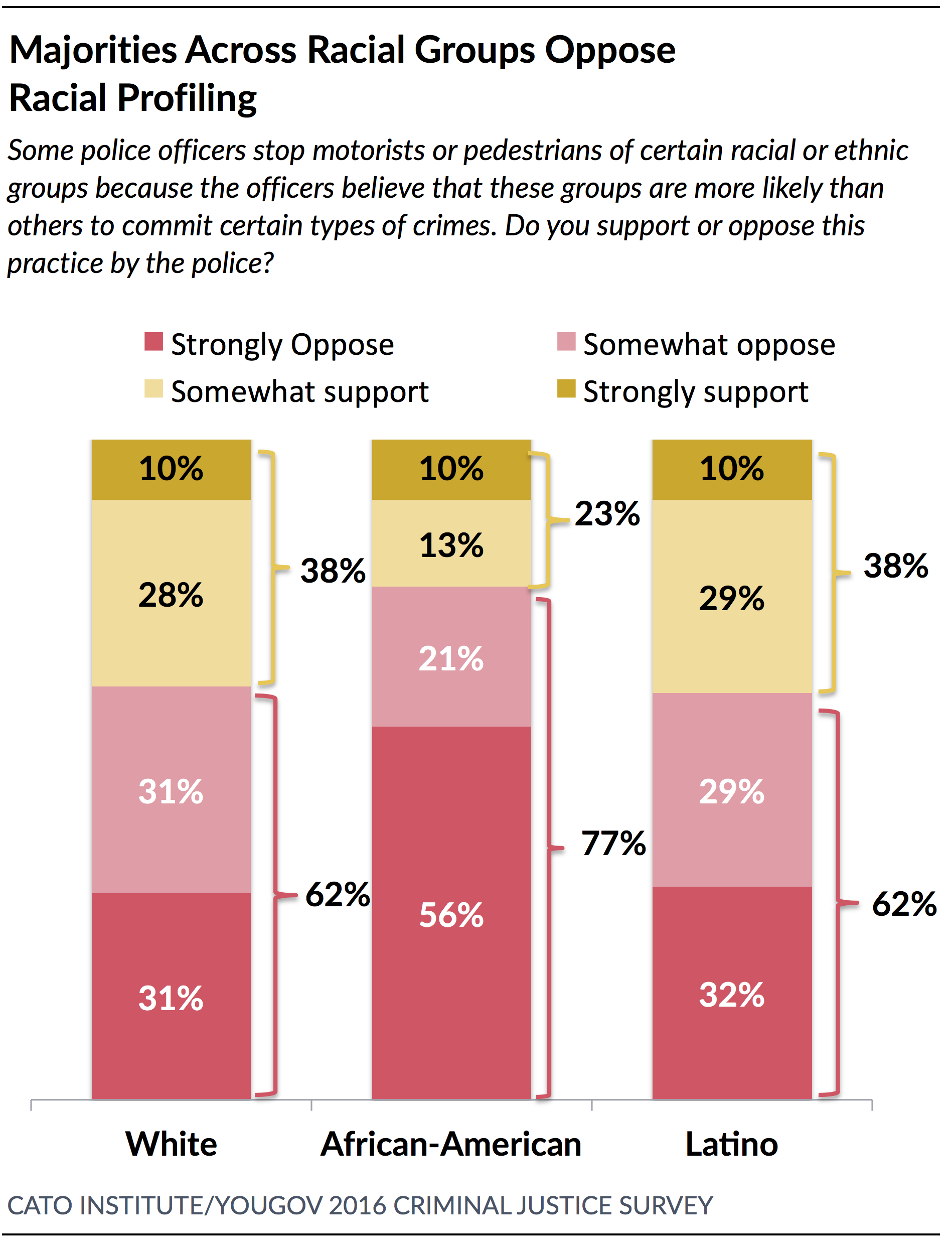 African Americans are the most opposed to racial profiling (77%), although majorities of both Latinos (62%) and whites (62%) also oppose. Black Americans are also nearly twice as likely to "strongly oppose" (56%) profiling as Latinos and whites (31%). Latinos and Caucasians are not significantly different in their support for racial profiling.