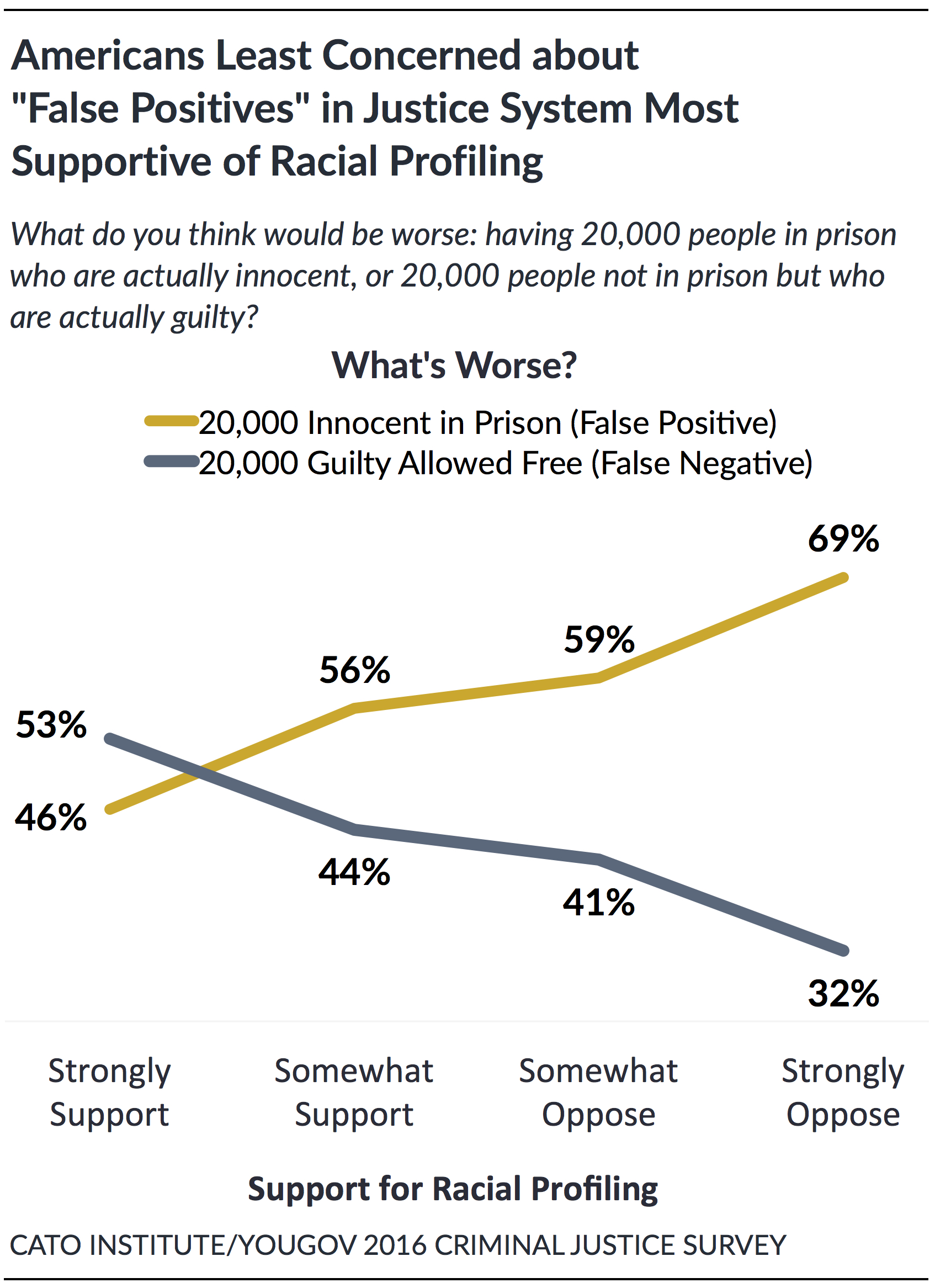 People who strongly support racial profiling are more likely to prioritize punishing guilt than protecting innocence. Among those who strongly favor police racial profiling, a majority (53%) say it would be worse to allow 20,000 guilty people go free rather than wrongly imprison 20,000 innocent people. Conversely, among those who strongly oppose racial profiling, 69% say it would be worse to imprison 20,000 innocent people than to allow 20,000 guilty people go unpunished. (Also see Blackstone's Ratio: Is it More Important to Protect Innocence or Punish Guilt.)