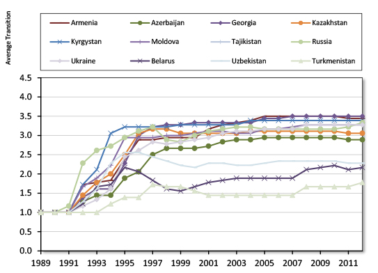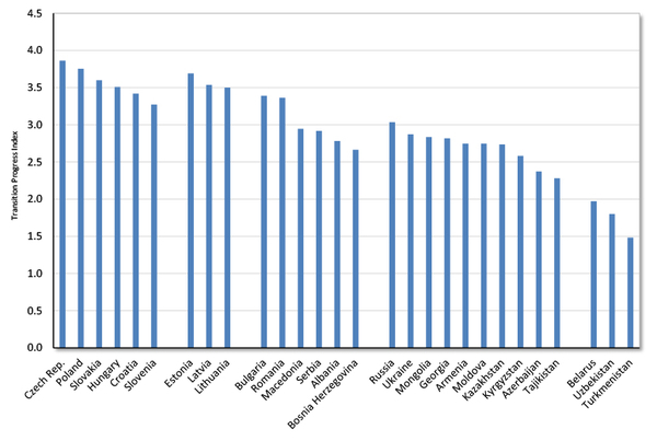 While this complexity may seem to pose a problem for analysis, there exists a reasonable quantitative metric called the Transition Progress Index (TPI), produced by the European Bank for Reconstruction and Development (EBRD). The TPI is measured on a scale from 1 to 4.3, with 1 representing "little or no change from a rigid centrally planned economy and 4.3 represent[ing] the standards of an industrialized market economy."1