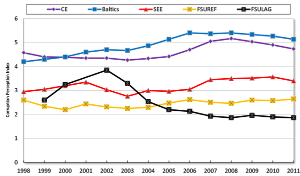 http://www.transparency.org/research/cpi/overview.Note: CE = Central European; SEE = Southeast European; FSUREF = Former Soviet Union, gradual reforms; FSULAG = Former Soviet Union, lagged reforms.