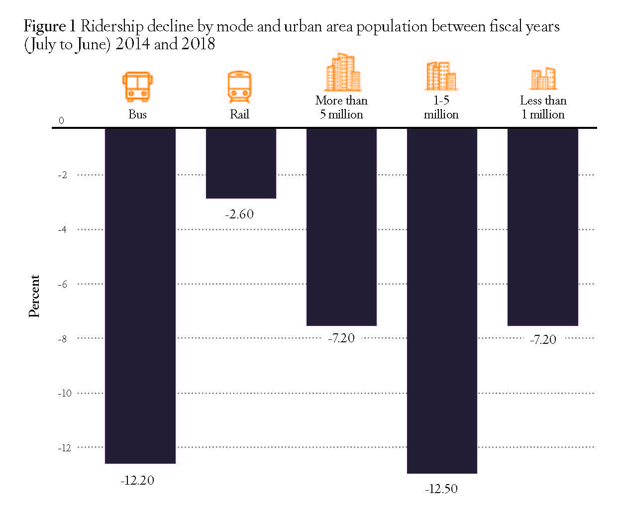 The 2008 financial crisis led nationwide transit ridership to fall through 2010, but it then recovered along with the economy for a few years. Since 2014, however, ridership has been steadily falling in almost every urban area despite a strengthening economy. Figure 1 shows that ridership is declining whether it is bus or rail and whether it is in large, medium, or small urban areas.2