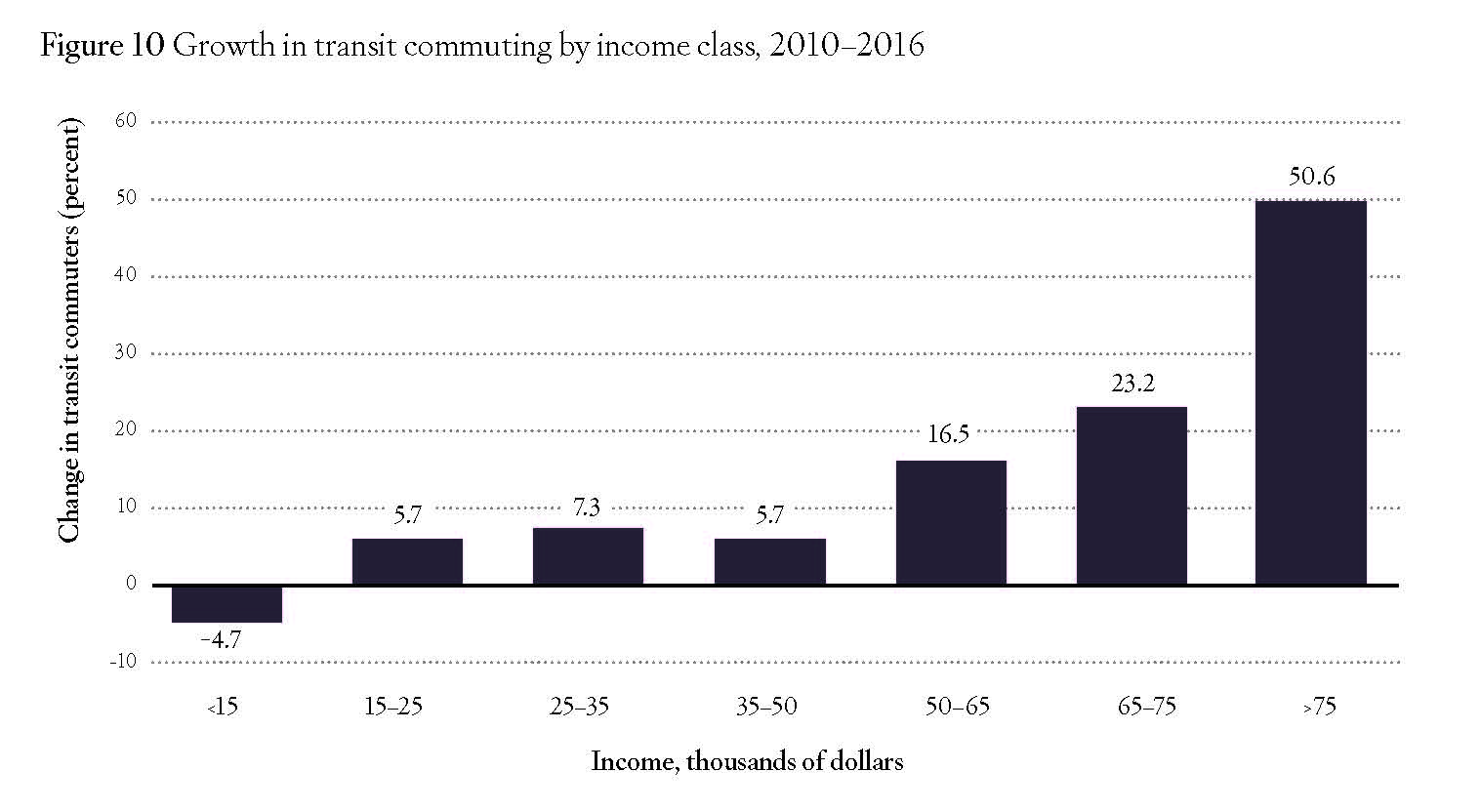 By 2016, the number of Americans earning less than $15,000 a year had fallen, but the share of people in that income class who rode transit to work fell even more. Transit’s main growth was in the $50,000 and higher income classes, especially $75,000 and higher (Figure 10). While the total share of workers who earned $75,000 and more had grown from 14 to 18 percent, they made up 24 percent of transit commuters. This compares with the 22 percent who earned under $15,000 a year. The average income of transit commuters had grown to nearly 12 percent more than the average income of all American workers.41