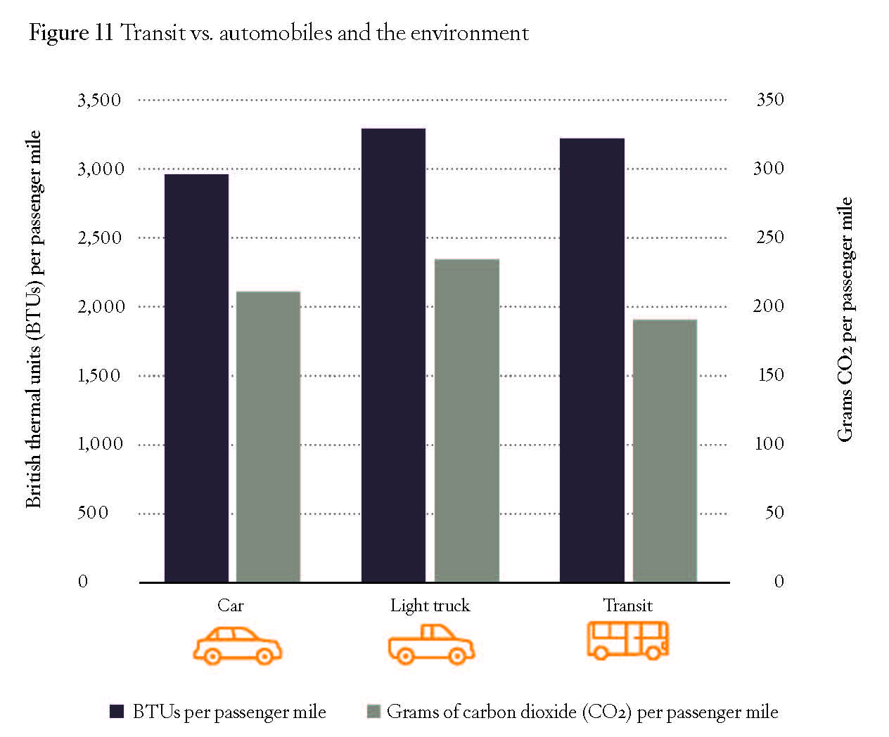 Riding transit in the New York urban area uses significantly less energy than driving a car: about 2,300 British thermal units per passenger mile vs. 3,000 in the average car.42 The same is true in only a few other urban areas, notably San Francisco–Oakland, Portland, and Honolulu. Nearly everywhere else, transit uses more energy and emits more greenhouse gases per passenger mile than driving, even for light trucks such as pick-ups and sport utility vehicles.